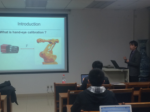 首先,潘辉博士进行了两篇学术论文的宣讲。第一部分主要对Eye-to-Hand Calibration做了介绍并对closed-Form Solution进行了重点研究;第二部分主要介绍了基于单目视觉的高精度空间合作目标相对位姿估计的难点和现有的相关工作,讨论了高精度位姿估计算法及实现,最后给出了综合实验及结果分析。